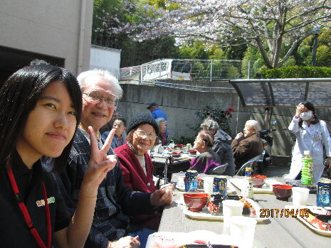 ケアハウスの皆様でお花見喫茶を行ないました。ご馳走とともに、昼間からのビールの味は格別…!?